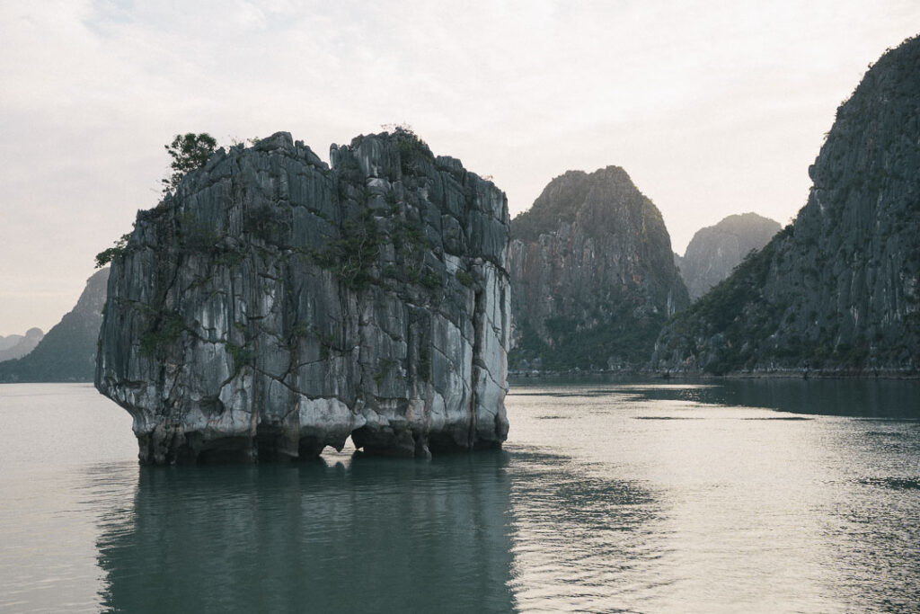 バスを降りてクルーズ船に乗り換える。ちょっと進むと、岩みたいな島、島みたいな岩が押し寄せてくる。美しいというより、どこか不自然な圧迫感がある。
